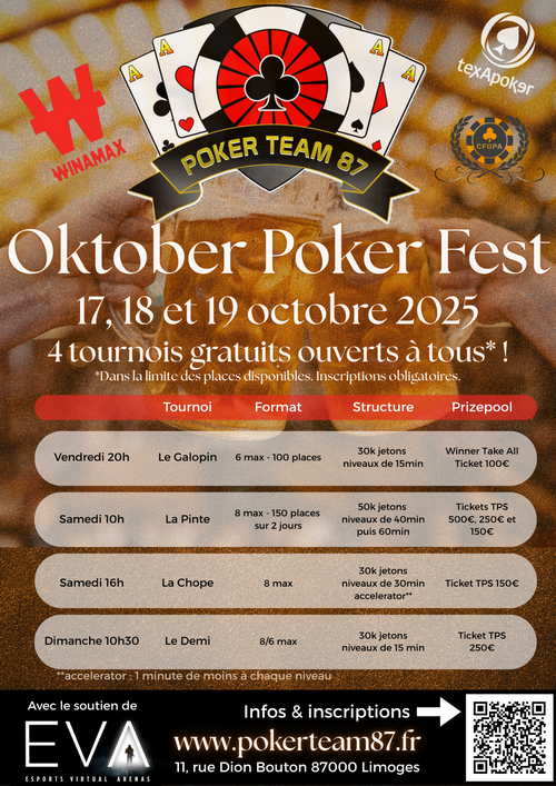 Toute l'équipe du PokerTeam87 est fière de vous inviter à l’Oktober Poker Fest, du 17 au 19 octobre 2025 à Limoges !